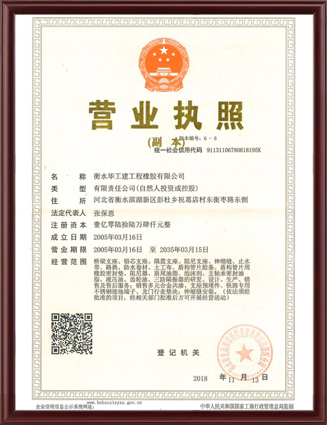 公司注冊資金10066.4萬元,于2007年通過了北京新世紀(jì)組織的ISO9001:2008質(zhì)量管理體系的認(rèn)證審核, 2006年12月,我公司獲得了公路橋梁支座全國工業(yè)產(chǎn)品生產(chǎn)許可證,2008年1月又獲得了橡膠密封制品全國工業(yè)產(chǎn)品生產(chǎn)許可證。與多家大專院校、科研單位建立了合作關(guān)系。2007年自主研發(fā)了建筑、設(shè)備隔震橡膠支座,并獲得了發(fā)明專利證書和實(shí)用新型專利證書